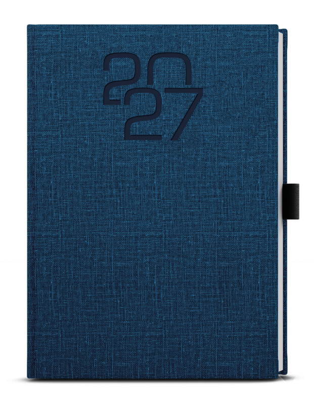 Týdenní diář modré barvy formátu A5 vyrobený ze zajímavého materiálu s moderní ražbou roku a poutkem na tužku.