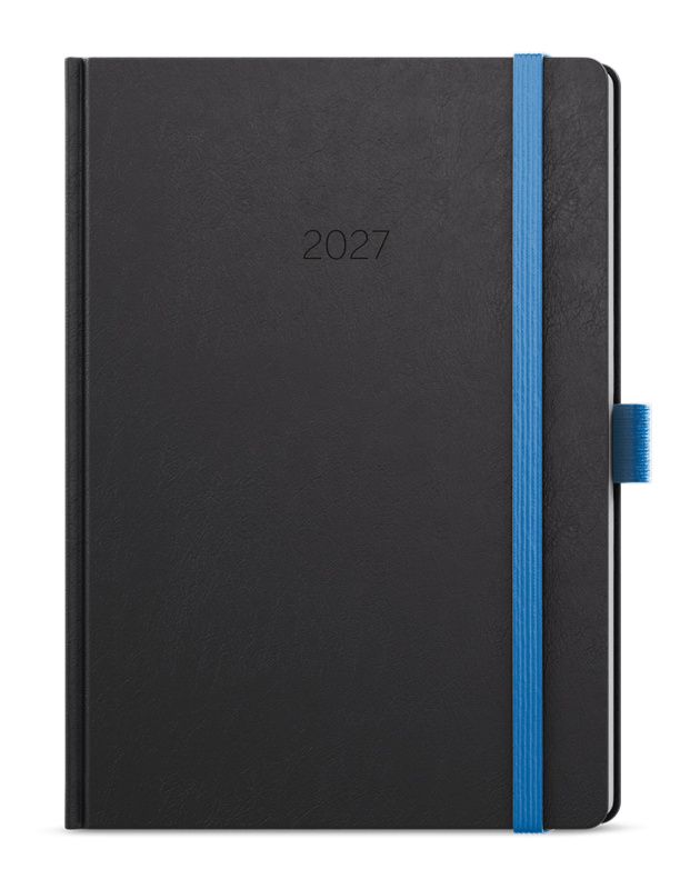 Neobyčejný týdenní diář s matným povrchem ze strukturovaného materiálu s modrou gumičkou a poutkem. Je vyráběný ve formátu A5, má velký prostor pro poznámky a plánování.