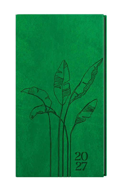 Kapesní týdenní diář v zelené barvě je vyráběný z jemné hladké vivelly s efektní ražbou s motivem Listů. Trendy a praktický doplněk do každé kapsy. Diář má velký prostor pro poznámky a plánování.