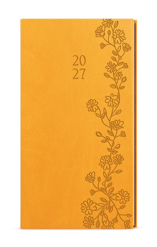 Kapesní týdenní diář v okrové barvě je vyráběný z jemné hladké vivelly s efektní ražbou s motivem Květin. Trendy a praktický doplněk do každé kapsy. Diář má velký prostor pro poznámky a plánování.