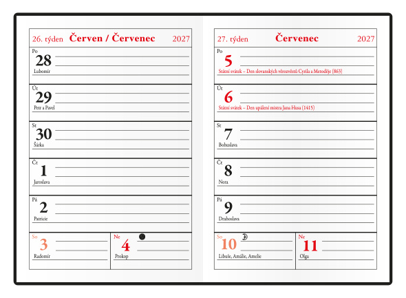 Materiál jemný hladký materiál PVC, potisk roku bílou barvou, šitá vazba V1 // ofset, 70g/m2