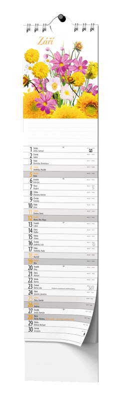 Netradiční nástěnný kalendář ve formátu kravaty s působivými obrázky kytic.