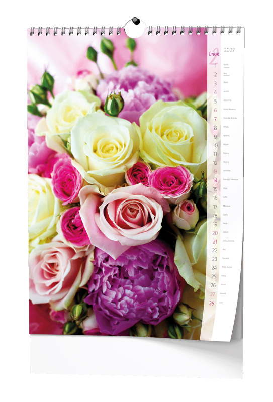 Nástěnný kalendář s obrázky barevných kytic a květů.