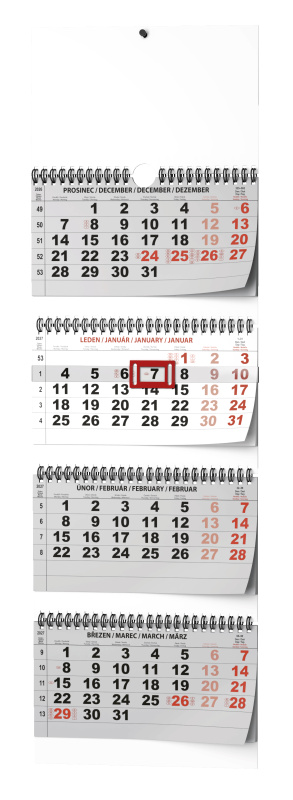 Praktický skládací nástěnný kalendář se čtyřměsíčním kalendáriem a posuvným jezdcem vhodný do Vaší kanceláře.