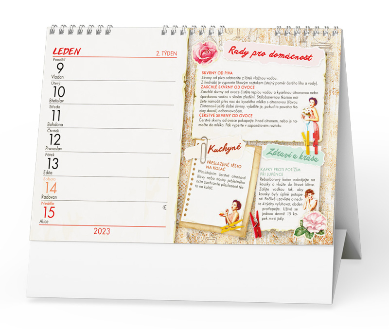 Stolní kalendář s týdenním kalendáriem a s tipy a triky pro domácnost.