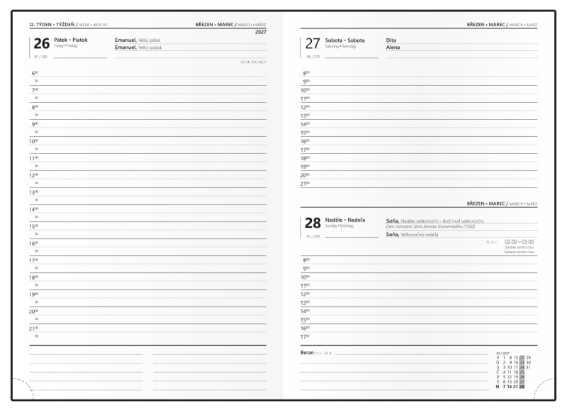 Denní diář formátu A5 je vyráběný z matného hladkého lamina s parciálním lakem, který dodává každému diáři šmrnc. Jedná se nejen o skvělý doplněk, ale také si budete moci efektivněji plánovat Váš čas.