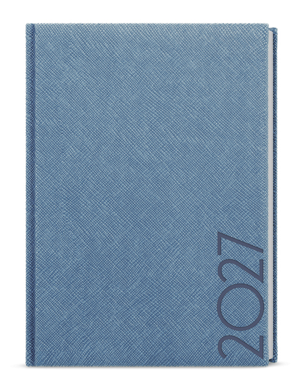 Neobyčejný denní diář s lesklým povrchem ze strukturovaného materiálu v modrošedé barvě je vyráběný ve formátu A5 a má velký prostor pro poznámky a plánování.