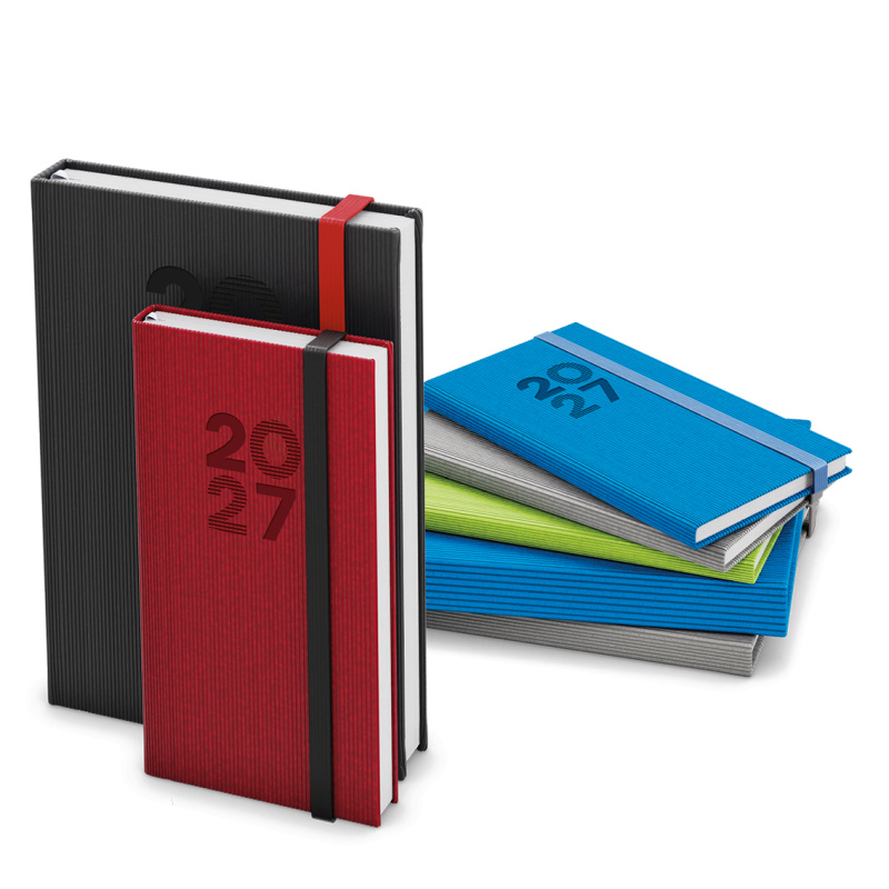 Denní diář formátu A5 vyrobený ze strukturovaného materiálu v oblíbených barvách a s gumičkou. Oblíbená grafika vnitřního bloku Vám pomůže účelně plánovat Vaše dny.