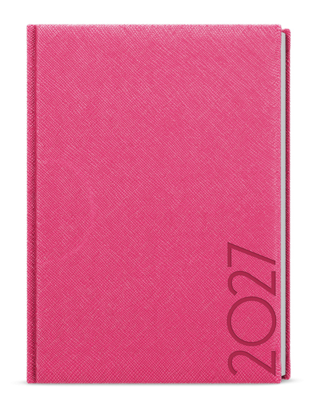 Neobyčejný týdenní diář s lesklým povrchem ze strukturovaného materiálu v růžové barvě. Je vyráběný ve formátu A5, má velký prostor pro poznámky a plánování.