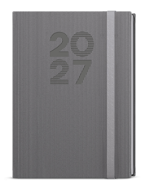 Týdenní diář formátu A5 vyrobený ze strukturovaného materiálu v šedé barvě a s gumičkou. Oblíbená grafika vnitřního bloku Vám pomůže účelně plánovat Vaše dny.