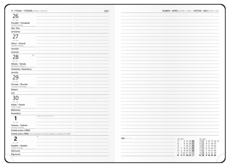 Diář s týdenním kalendáriem na jedné straně a na druhé straně s prostorem na poznámky. Desky jsou vyrobeny ze strukturovaného lesklého materiálu s jednostrannou pěnovou výplní a s kulatými rohy.