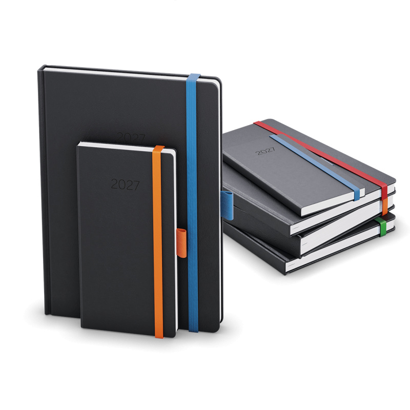 Materiál V8, pololesklý, jemně strukturovaný materiál, ražba roku, gumička a poutko, stužka, perforované rožky, kulaté rohy // ofset, 70g/m2