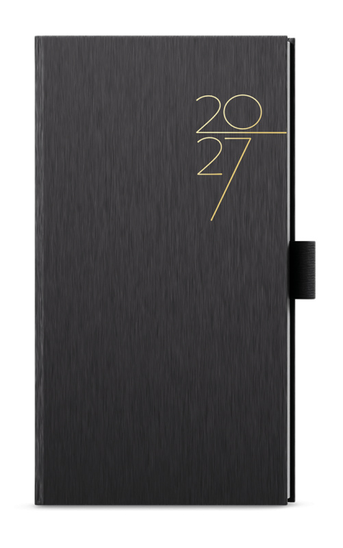 Kapesní týdenní diář v lesklé černé barvě se strukturovaným povrchem. Moderní doplněk do každé kapsy. Diář má velký prostor pro poznámky a plánování.
