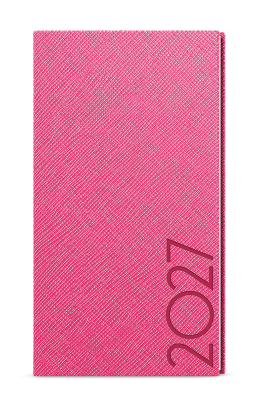 Kapesní týdenní diář v růžové barvě se strukturovaným povrchem. Moderní doplněk do každé kapsy. Diář má velký prostor pro poznámky a plánování.