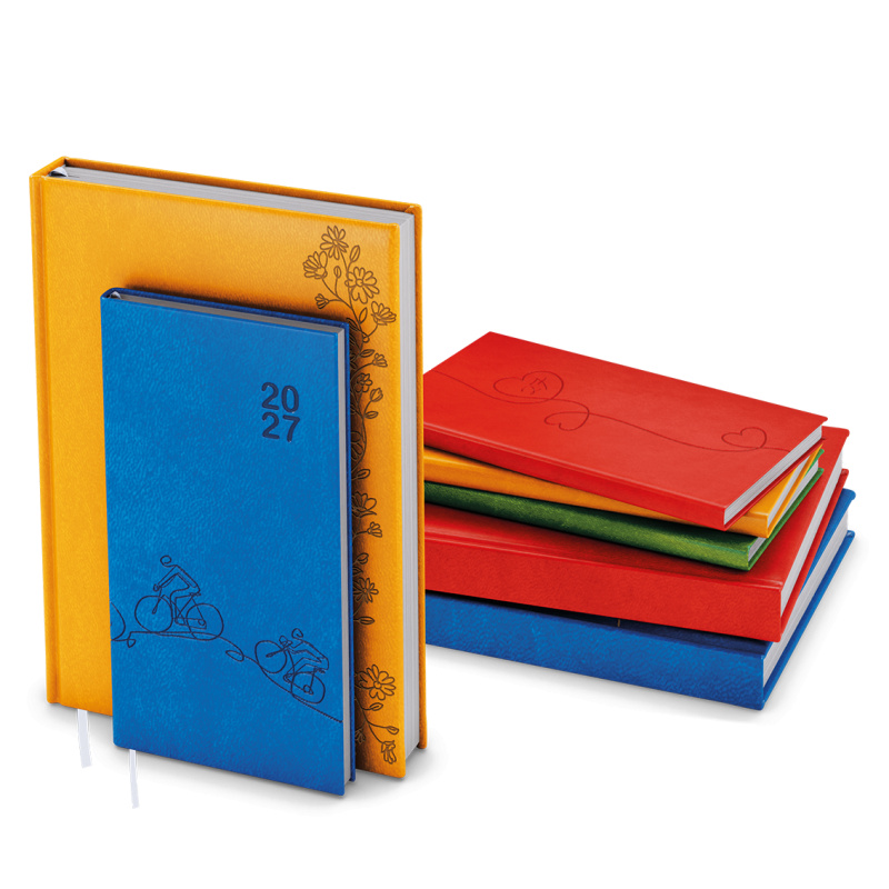 Materiál jemný hladký materiál, ražba motivu a roku, šitá vazba V8, stužka, perforované rožky ofset, 70g/m2